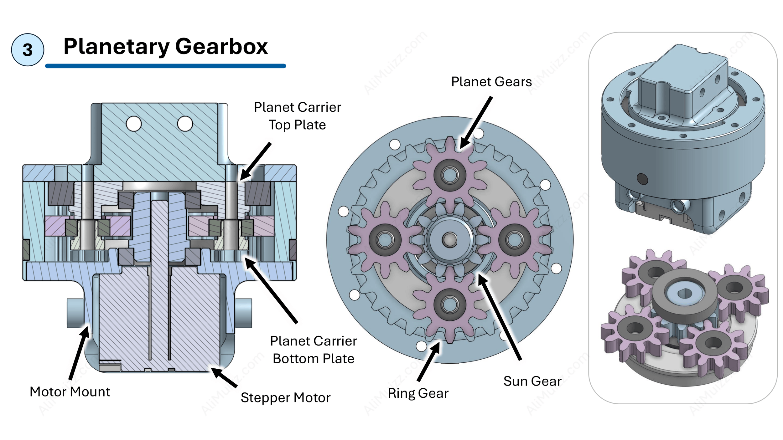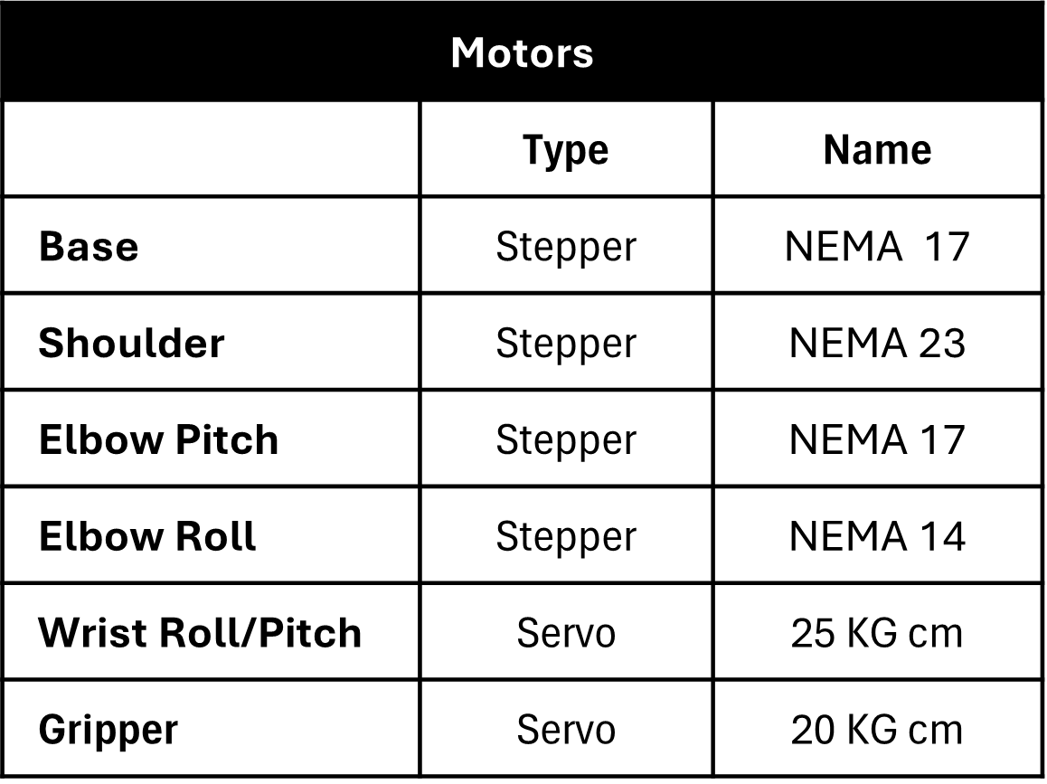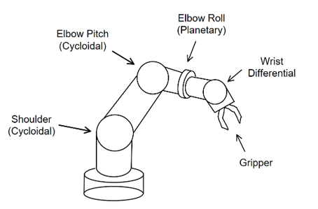 [3] Planetary Gearbox: Provides the 6th DOF (elbow roll) which allows the gripper to pitch sideways instead of vertically