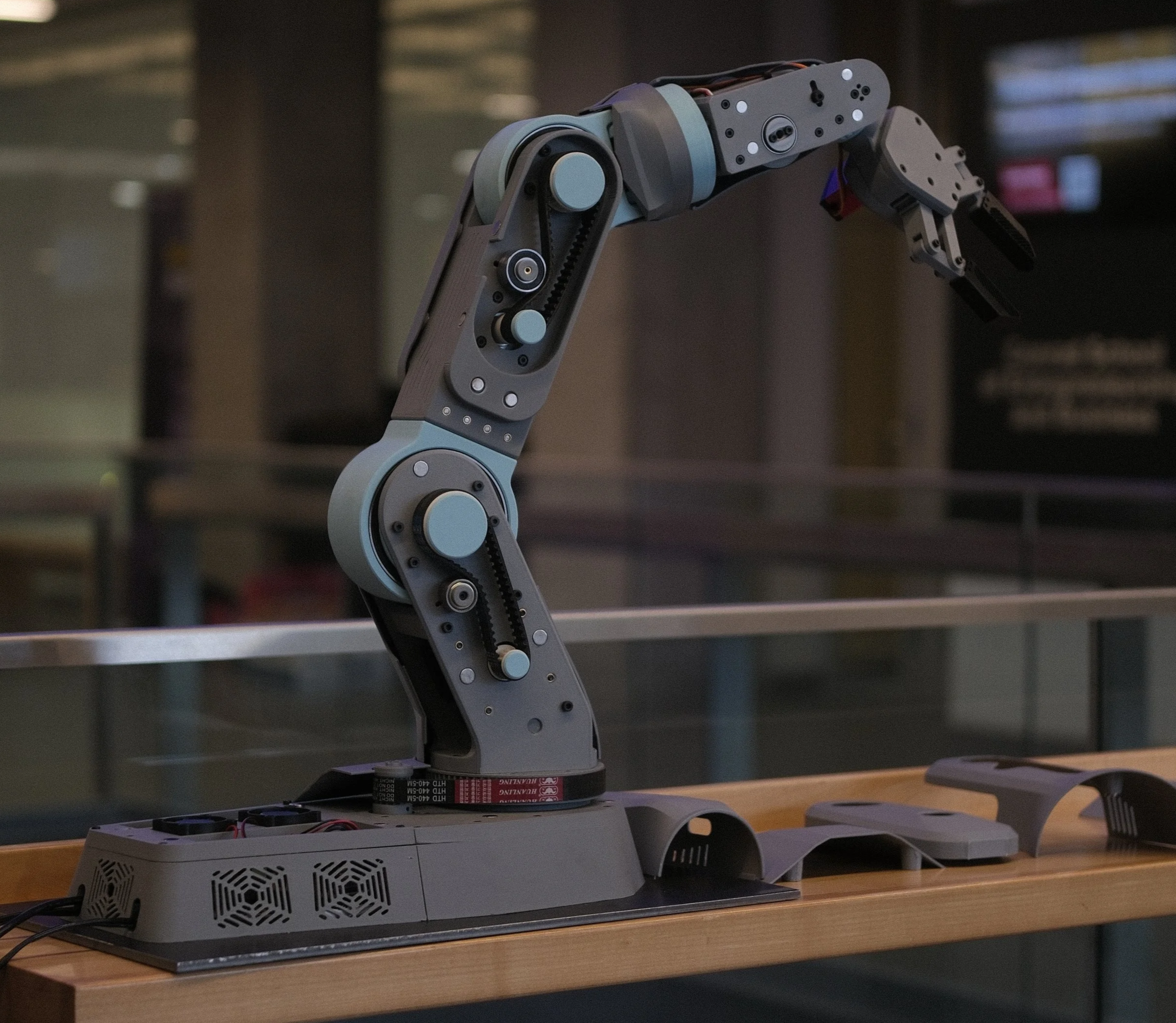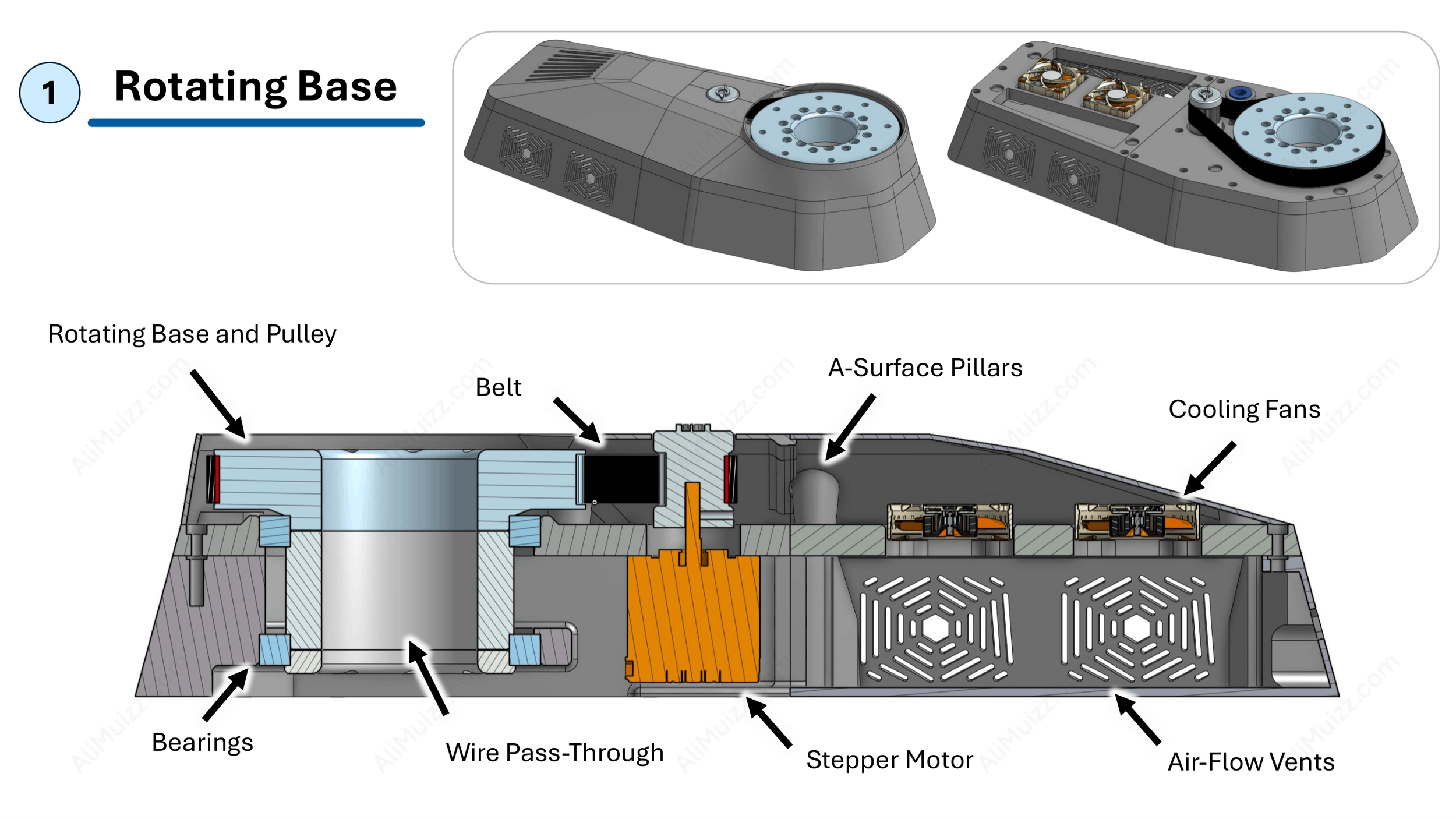 [1] Rotating Base: Belt-Driven Motion, also acts as the electronic enclosure with active cooling using two fans