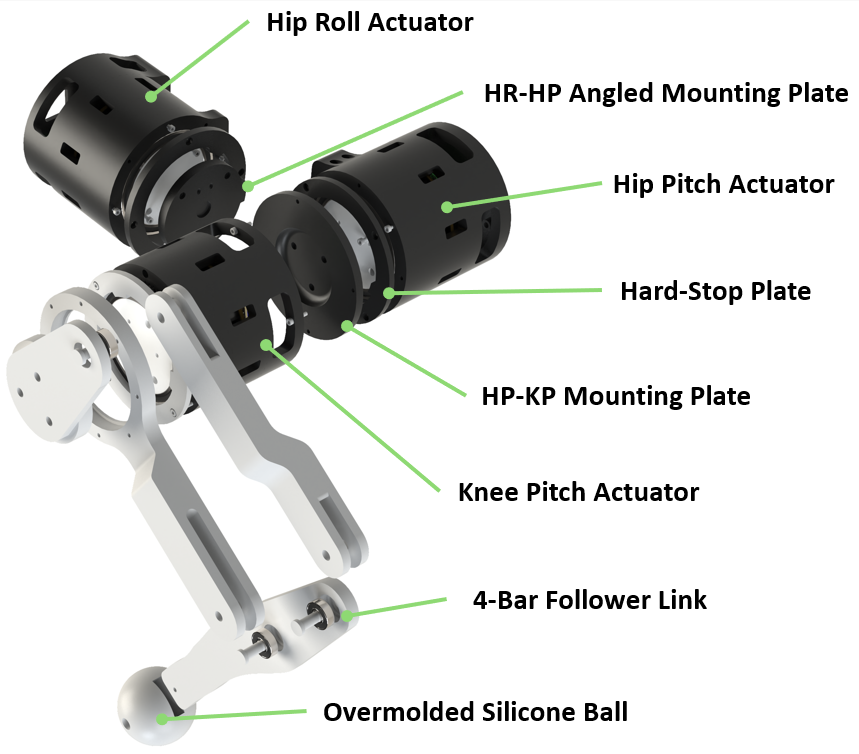 Developed a 3 DoF leg including custom 8:1 planetary gearboxes and a 4-bar linkage to replicate quadruped gait